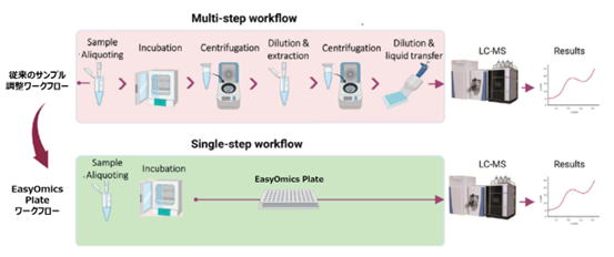 EasyOmics Plate を用いることで、従来の LC-MS サンプル調製に必要な複数のステップをワンステップで行うことができます。 |