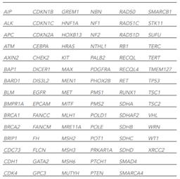 本パネルは、遺伝性癌の発症リスクの増加に関連する遺伝子を分析するために設計されています。関連する癌には、乳癌、卵巣癌、子宮癌、皮膚癌、前立腺癌、胃癌、結腸直腸癌、膵臓癌などが含まれます。パネルは、37の遺伝子の一塩基変異(SNV)および短い挿入や欠失(indels)、さらに