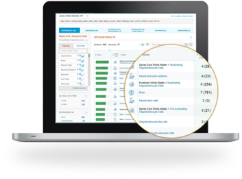 発現ベース解析には、マニュアルキュレーションで収集、フィルタリング、モデル化、アノテーションが付与され、ナレッジベースに統合されたデータに基づいています。正常組織と疾患組織、そして細胞の遺伝子発現データは、それぞれ異なるセクションに分けられて表示されます。 |