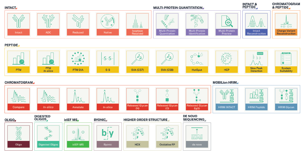HCP(Host Cell Protein)やADC(Antibody Drug Conjugate)の検出など、バイオ医薬品の特性評価に利用する、様々なワークフローを標準搭載。 |